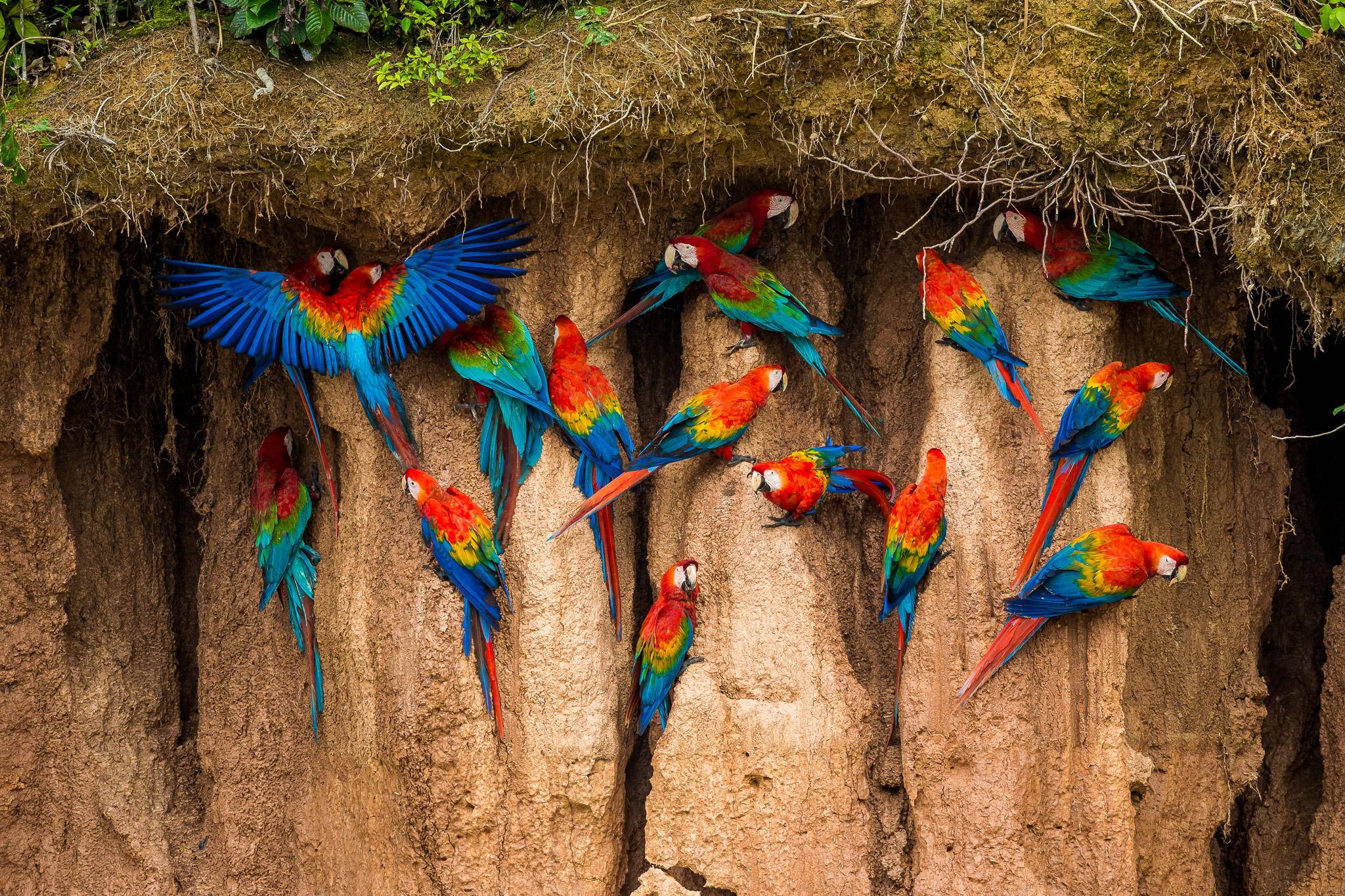 Having eaten these nutritious but poisonous seeds, macaws fly towards a rocky place. There they gnaw on and swallow some clay-containing rocks. This is not random behavior. Indeed, rocks that contain clay absorb the poison of the seeds. This is how the macaw can digest the seeds without being harmed by them.
