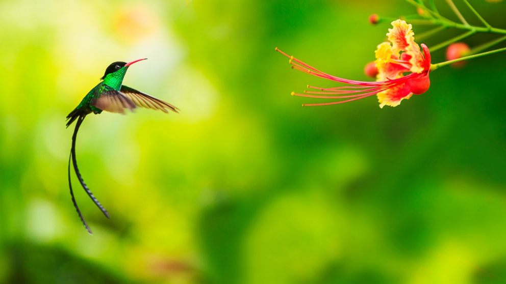 The hummingbirds’ primary nutrition source is the nectar of flowers. While feeding, they stand in place, quite differently from other birds. Clapping their airfoils at least sixty times per second in a figure-eight configuration, they hover in the air and they take in nectar from the flower without moving their bodies.