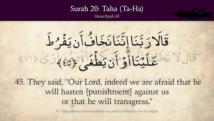 Our Lord, we fear that he may be beforehand with us or that he may play the tyrant. (Ta-Ha 20:45)